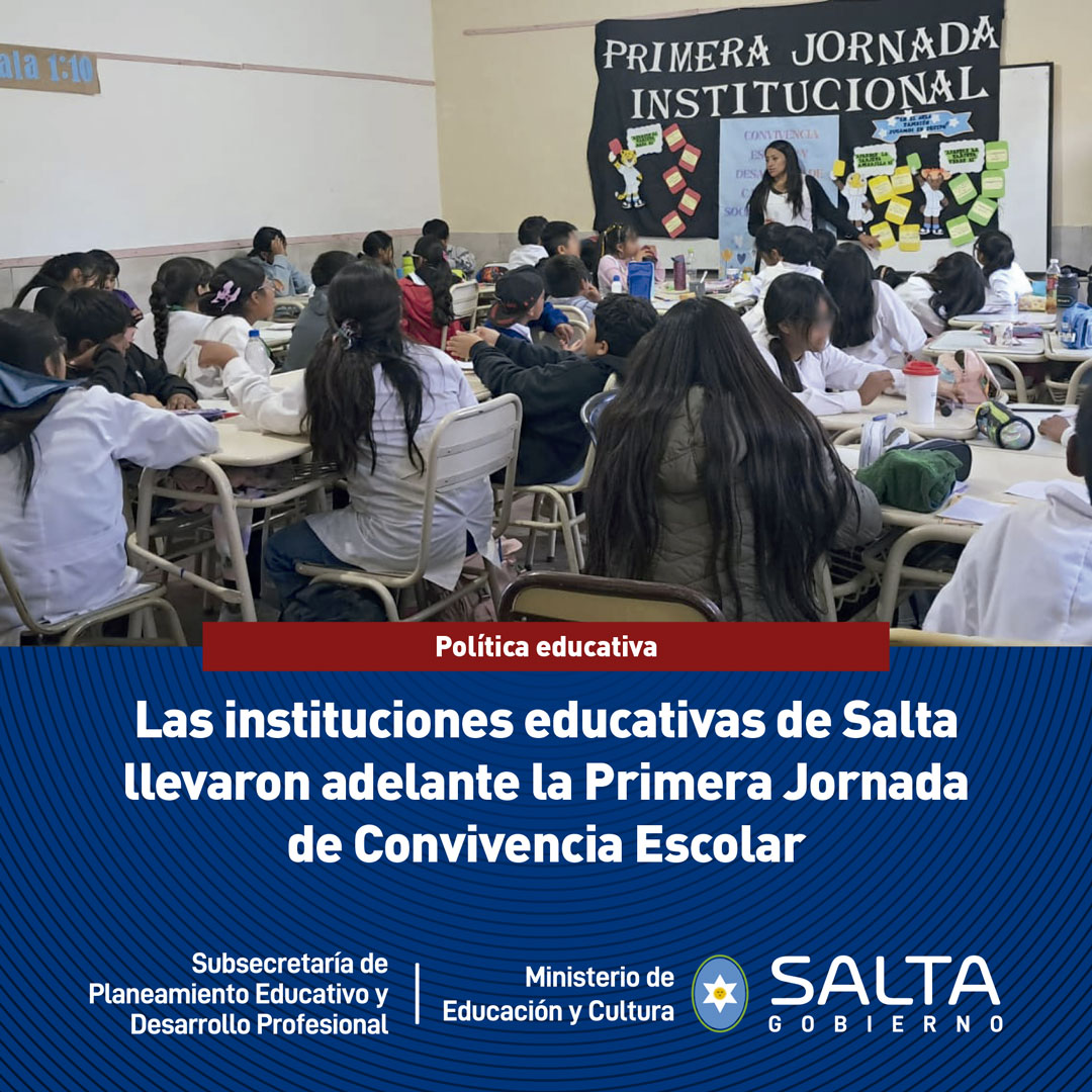 El pasado 14 de abril, el Ministerio de Educación y Cultura de Salta, a través de la Subsecretaría de Planeamiento Educativo y Desarrollo Profesional, concretó la Primera Jornada Institucional de Convivencia Escolar y Desarrollo de Capacidades Socioemocionales. La actividad involucró a instituciones educativas tanto de gestión estatal como privada en todo el territorio provincial.