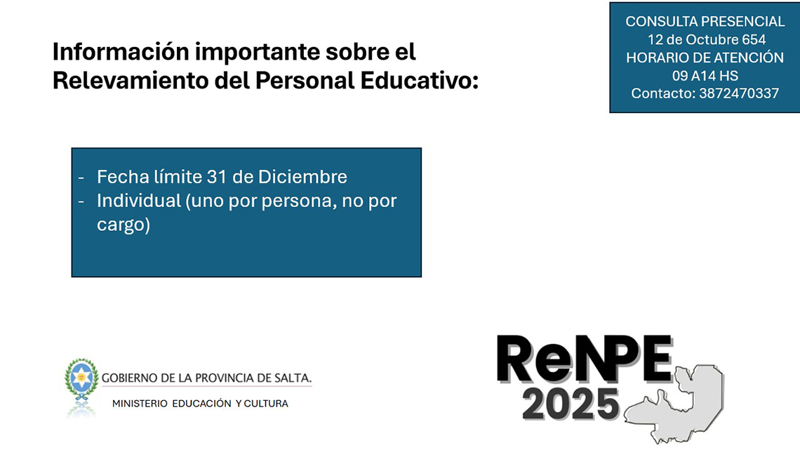 Este espacio ha sido creado por la Dirección General de Información Educativa del Ministerio de Educación, Cultura, Ciencia y Tecnología de Salta para difundir y socializar la implementación del ReNPE 2025 en nuestra provincia y nivel nacional.