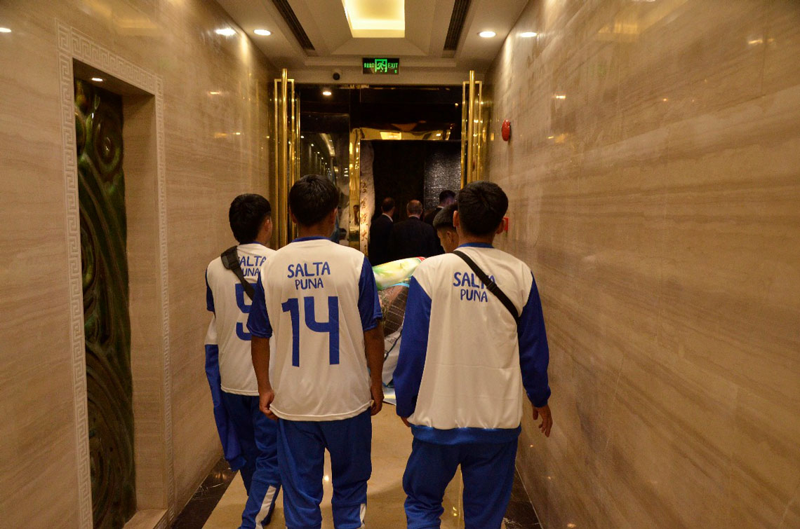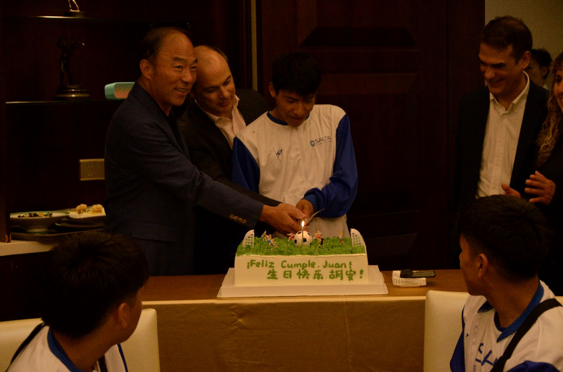 Tras un viaje de más de 30 horas desde la Capital salteña, el equipo de fútbol, su cuerpo técnico y la comitiva que los acompañaba fueron recibidos en la ciudad de Shanghai por el presidente de la empresa Xizang Zhufeng Resources Co. Ltd.; Sr. Huang Jianrong y el CEO de la misma; Mao Yuankai en una cena tradicional china de la que también participaron el Embajador Argentino Marcelo Suárez Salvia y el Cónsul de la Ciudad Luciano Tanto Clement.